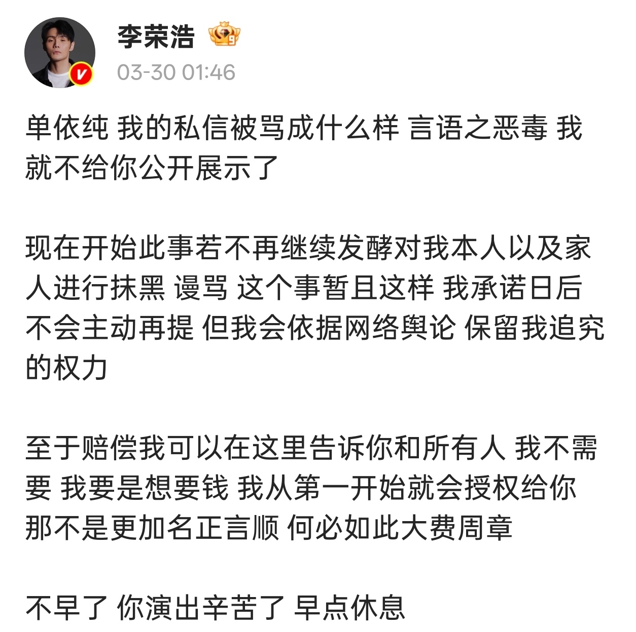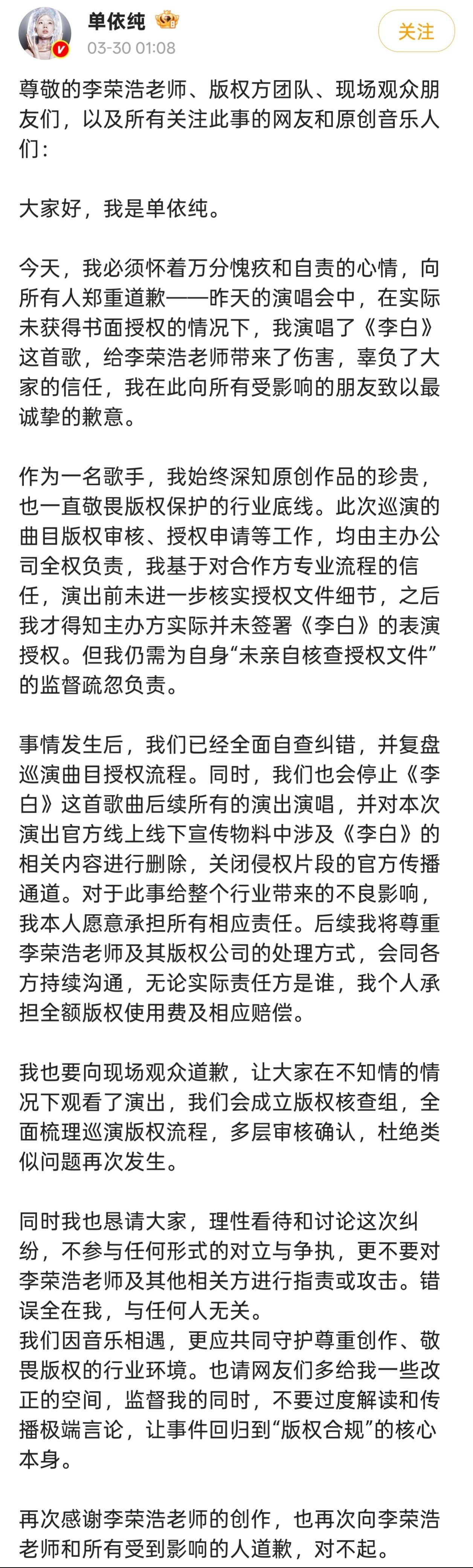 3月30日凌晨,歌手单依纯发长文,再次回应被李荣浩喊话侵权演唱《李白》一事并道歉;李荣浩随后回应称:“我不是想要钱。”