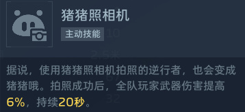 假如你的自拍中有队友,他们也会变成猪头滤镜。并且技能是没有冷却的,另外启动后可以给队友增加伤害。