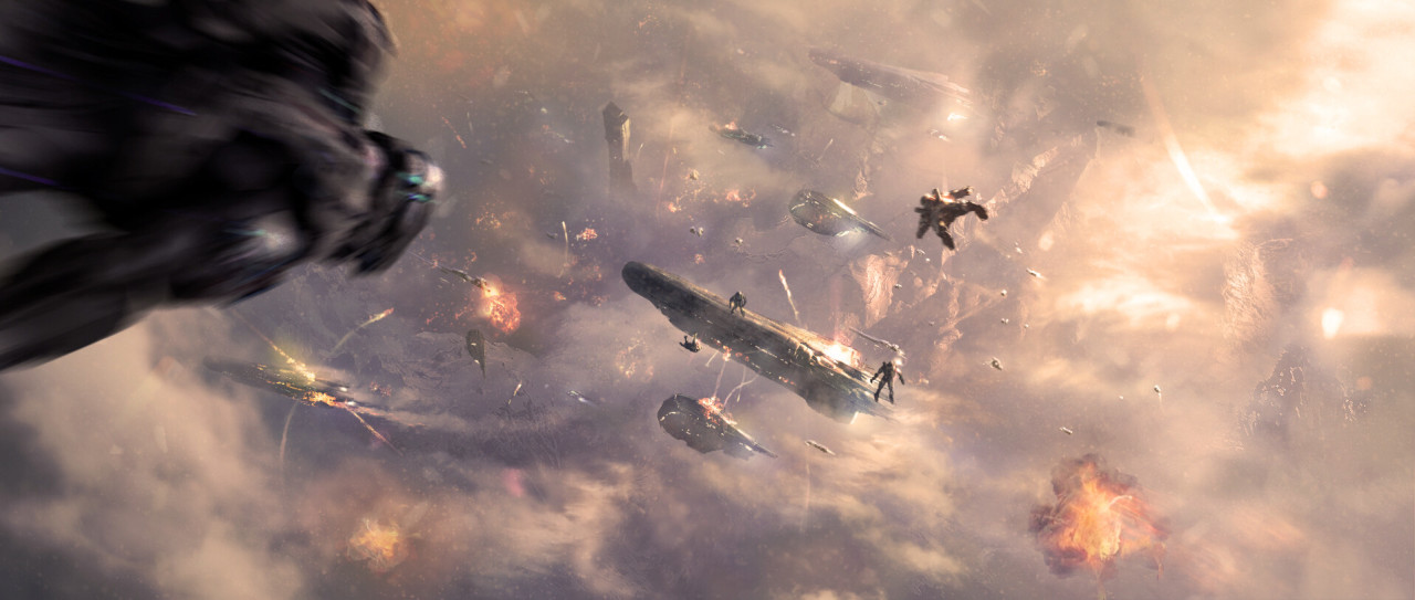 洛克带着小队跳过去,从太空直接空降,穿过星盟和普罗米修斯的战舰战场,用盔甲的推进器控制降落,落到了山上。