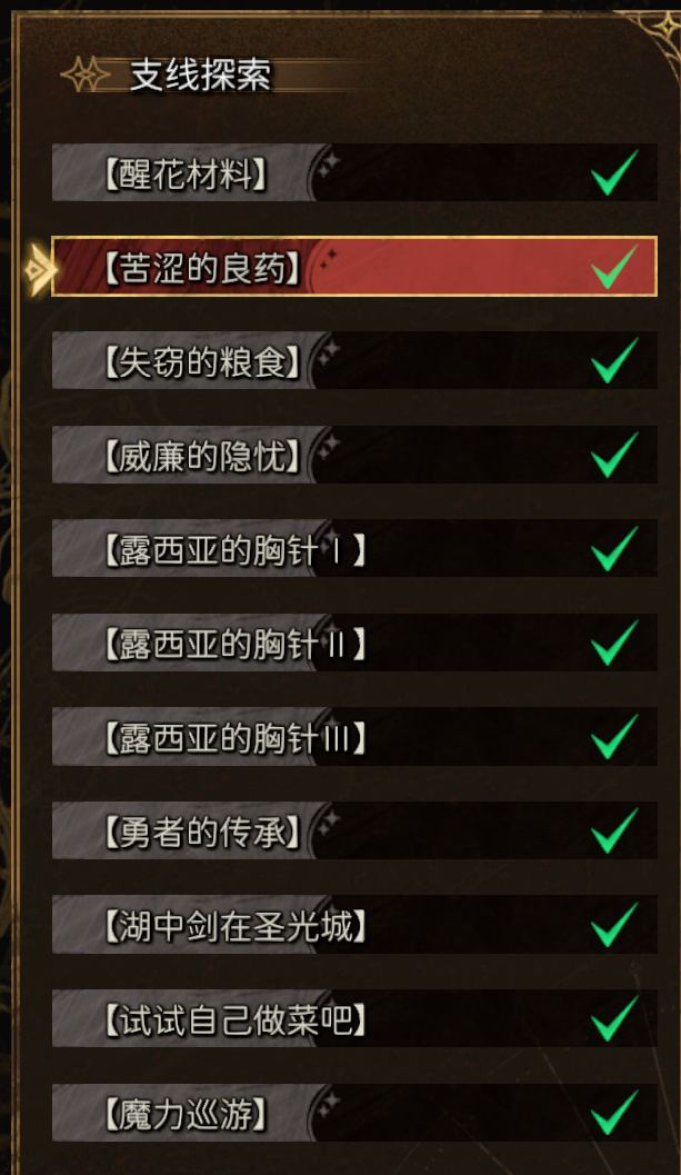 游戏从大森林到圣光岛的支线除了有两个“???”没找到触发条件外,我已全部完成,基本都是针对单一迷宫的反复跑腿任务。到了第二章,就没有支线任务了。