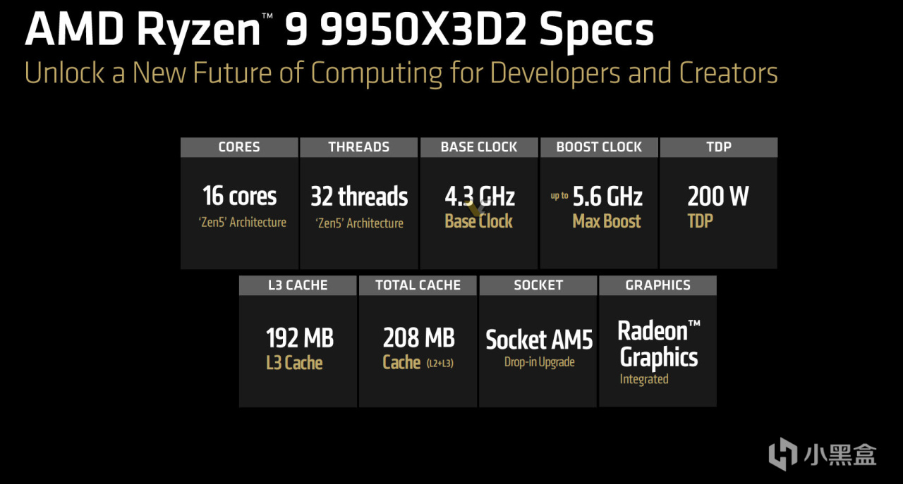 Ryzen 9 9950X3D2 双缓存版是一款 16 核 32 线程处理器,采用“Zen 5”架构和 3D 垂直缓存技术,其两个 8 核 CCD 均配备堆叠式 3D 垂直缓存,封装内 L3 缓存容量为 192 MB,总缓存(L2+L3)容量为 208 MB。