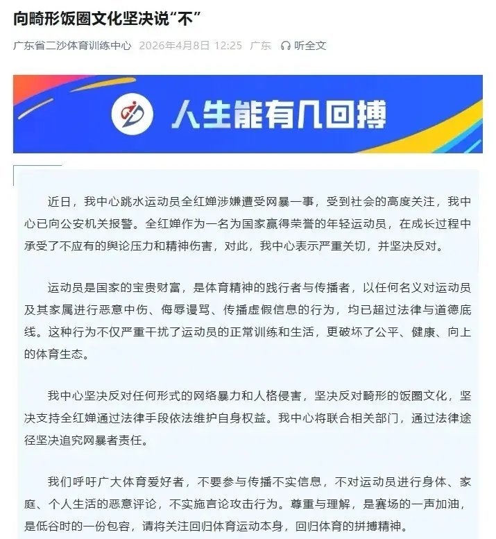 4月8日:全红婵所属广东省二沙体育训练中心发布声明,确认已正式报警 。