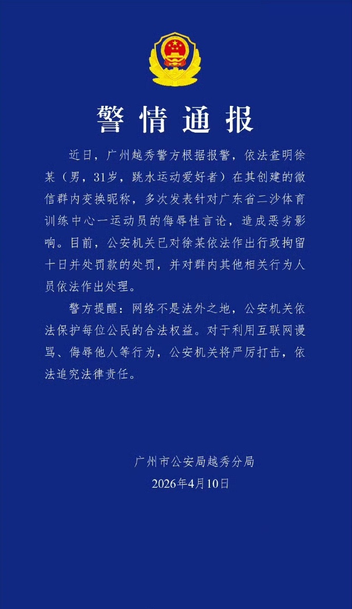 2026年4月10日,针对奥运跳水冠军全红婵遭长期有组织网络暴力一事,广州市公安局越秀分局于今日(4月10日)发布官方通报,对案件核心人员作出处罚决定 。