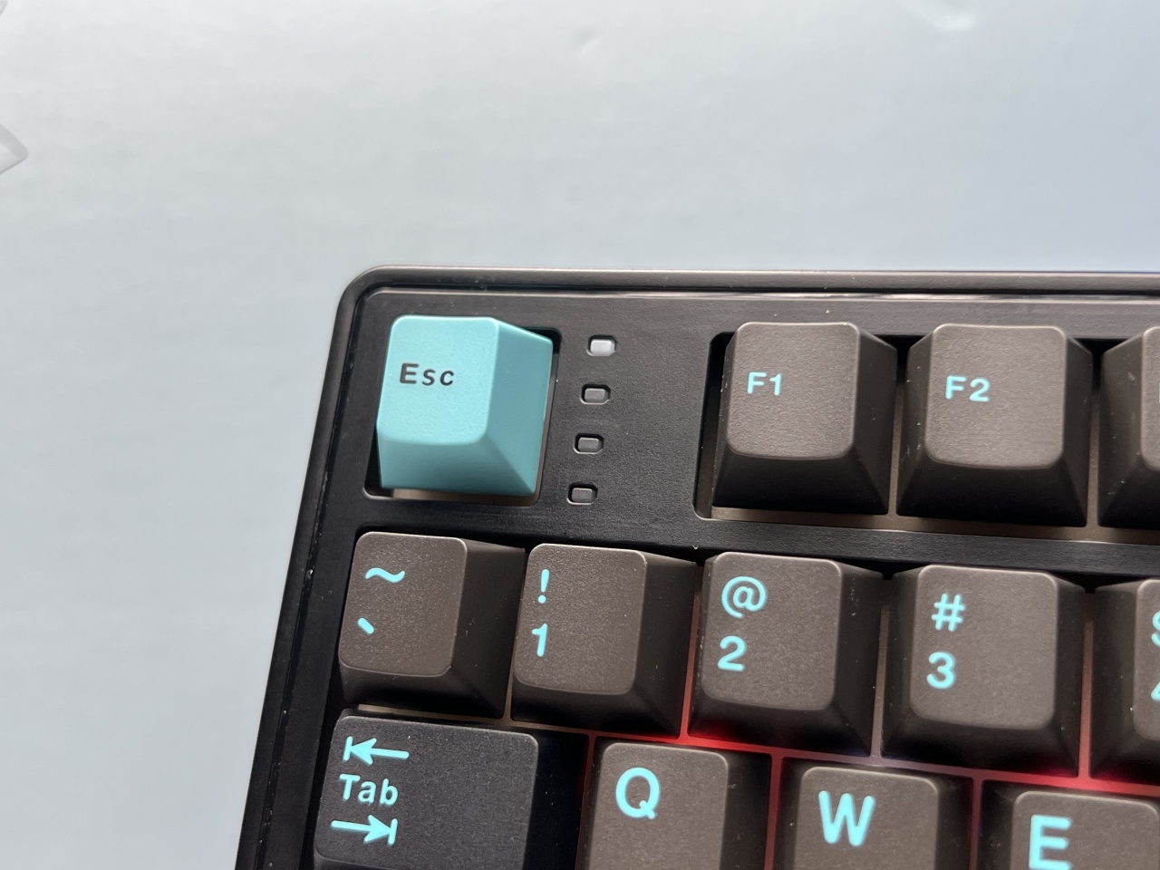左上角ESC处的四个指示灯依次是键盘连接状态指示灯、大小写指示灯、滚动锁定指示灯、Win键锁定指示灯;