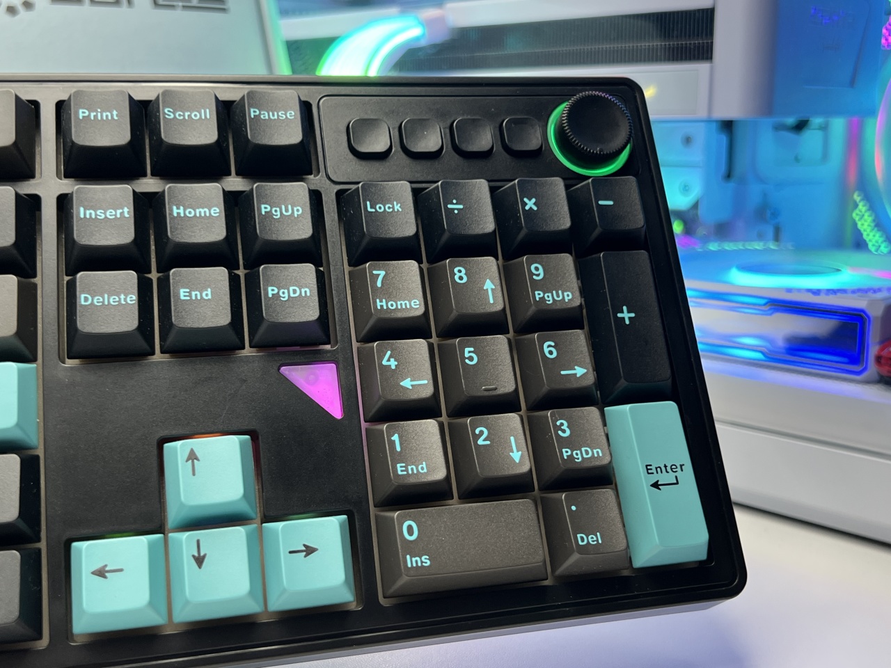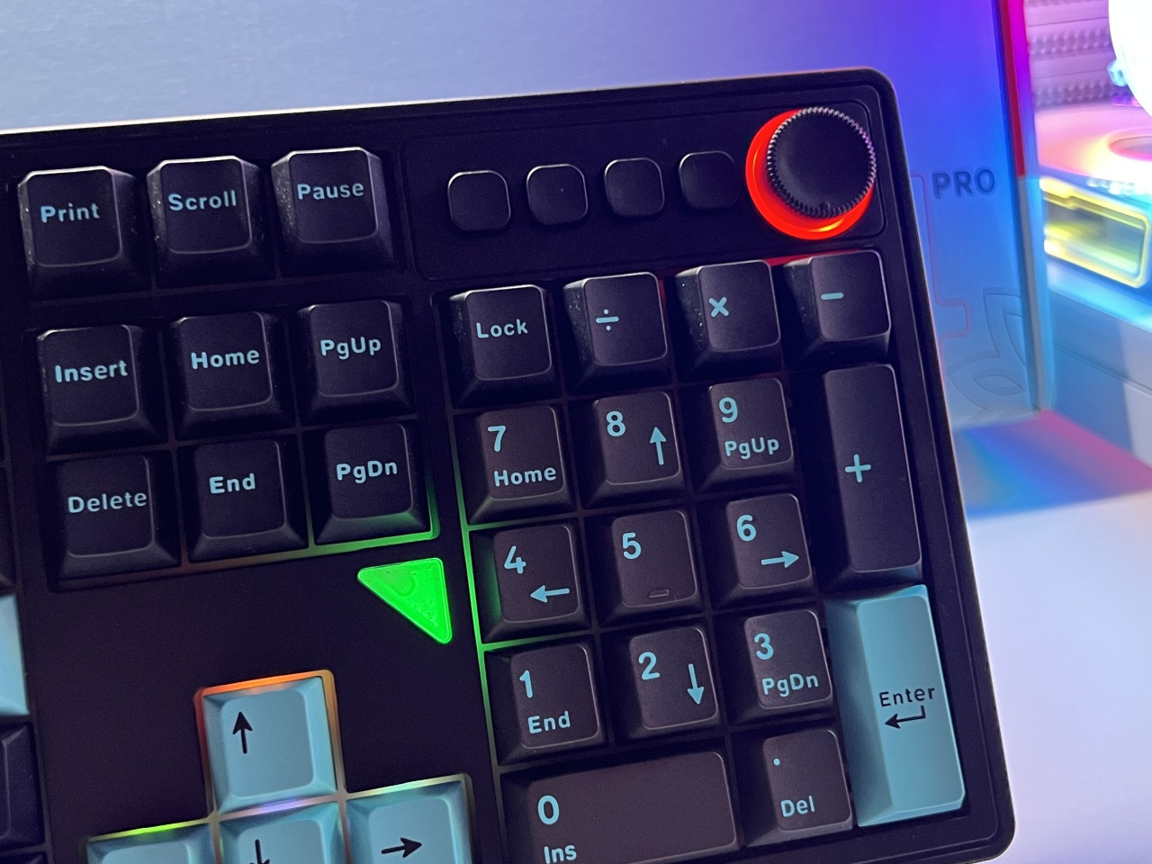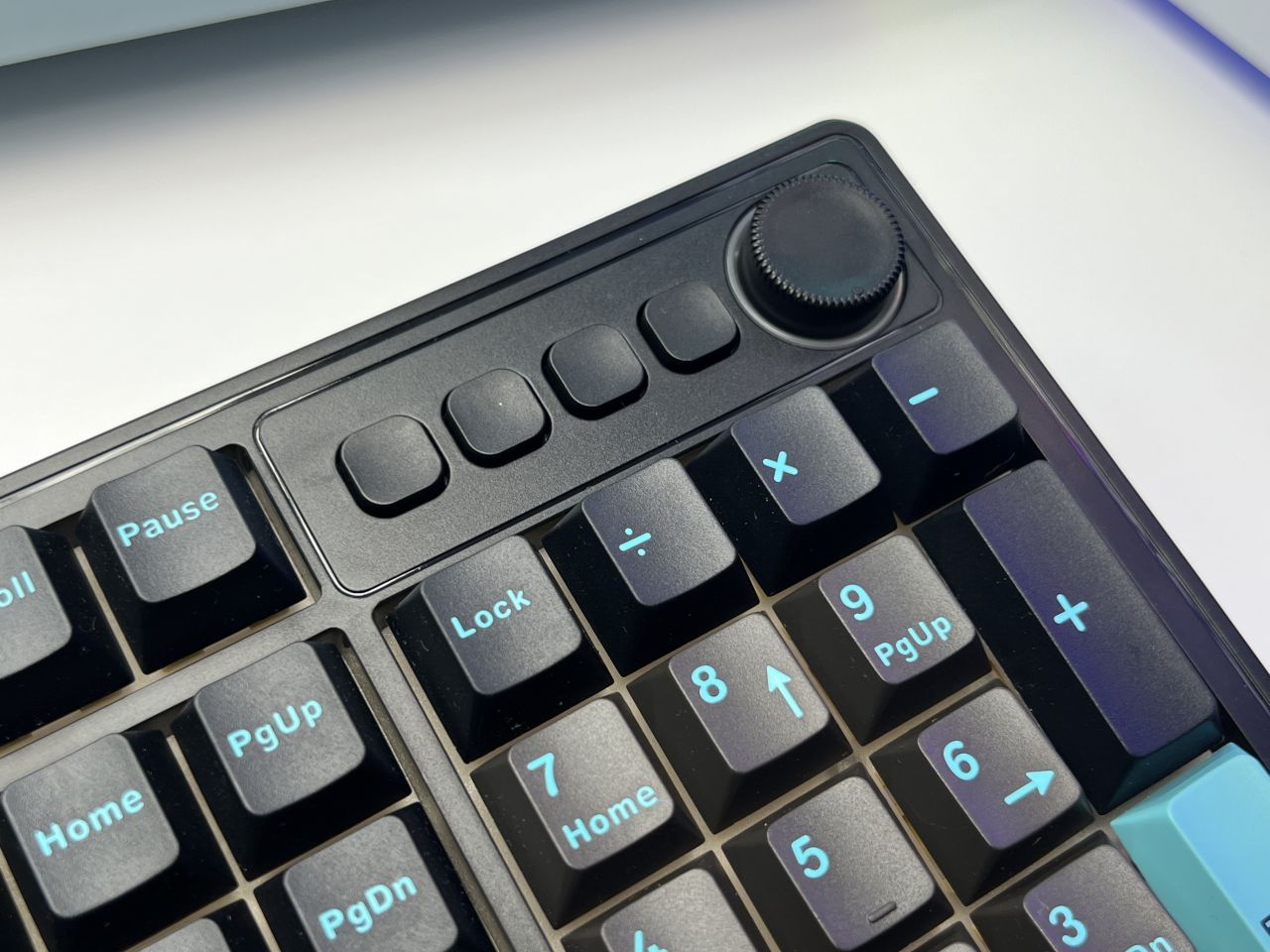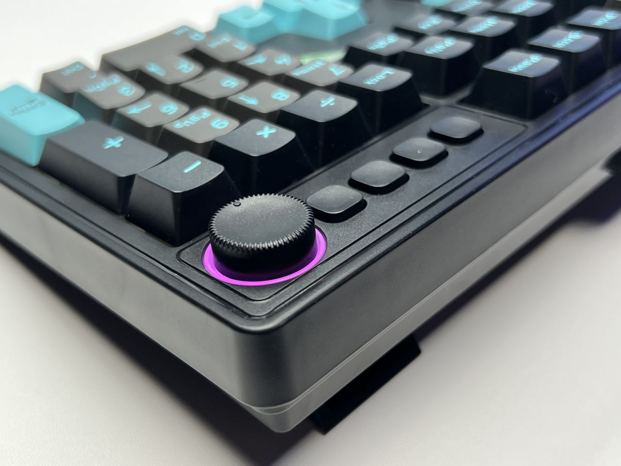 右上角也是用上了目前大受欢迎的多媒体旋钮+按键组合,比较可惜的是这个旋钮不是铝合金材质的,但凡旋钮用上铝合金都能给这把键盘的质感提升一个小档次。好在塑料滚轮的刻度感比较清晰,然后下面还设计了一圈RGB灯环,支持不同颜色变幻。