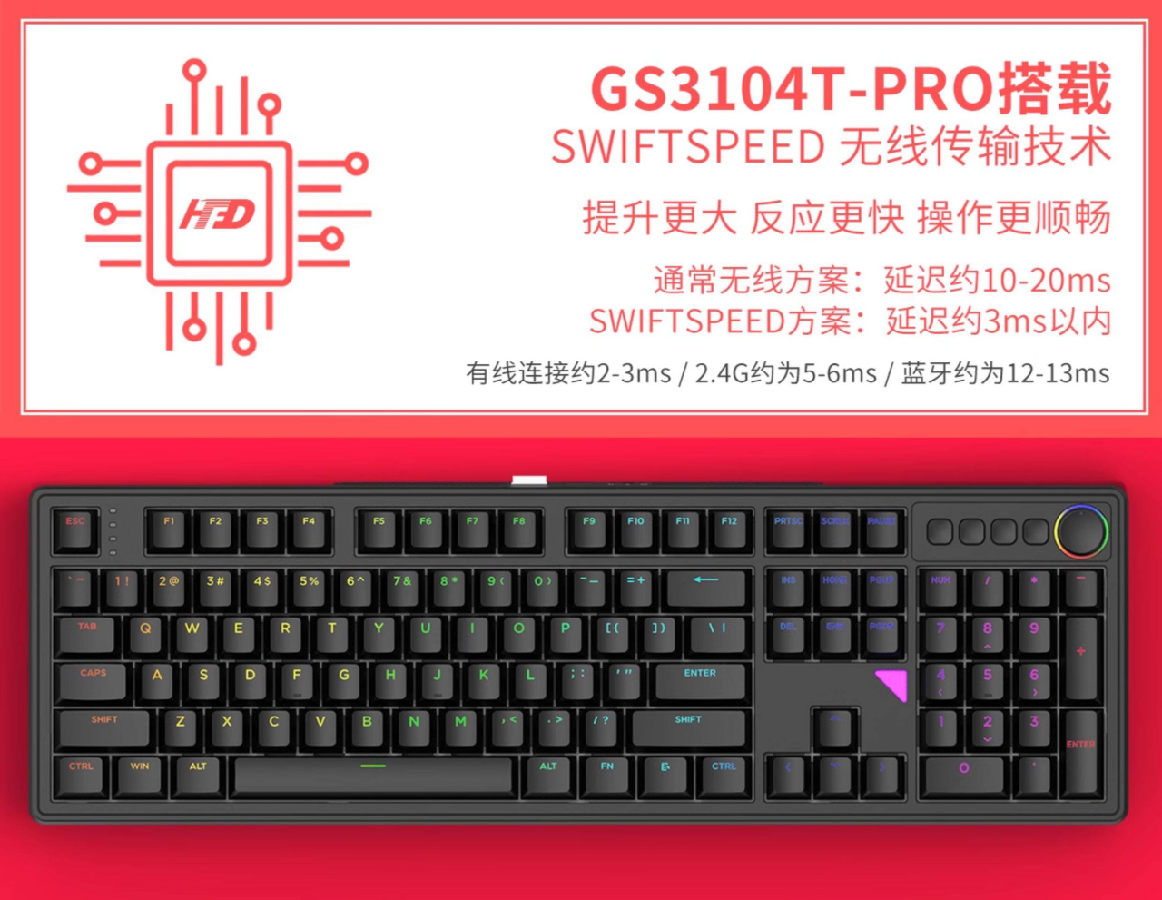 当然游戏专用不仅仅是因为轴体触发快,GS3104T PRO还搭载了Swiftspeed无线传输技术,这套技术能给键盘带来3ms以内的延迟,要比常规键盘延迟更低。