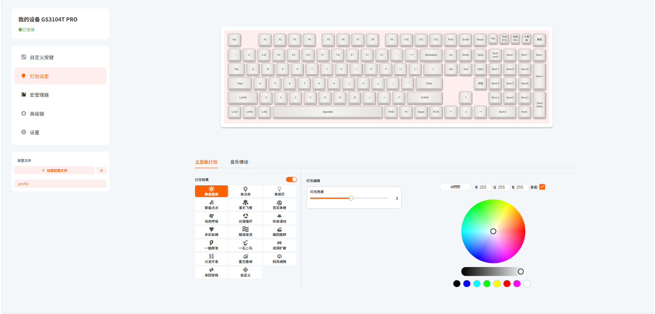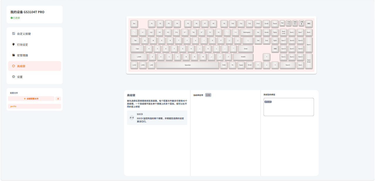 驱动该有的功能,包括改键、宏录制、调节灯光都有,甚至还有高级键功能,此外还能调节连接延迟和休眠时间。