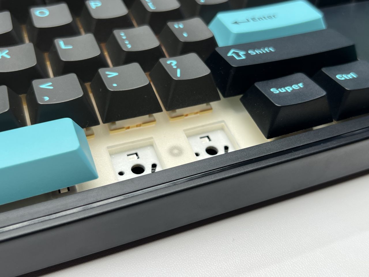 定位板也升级成了PC材质定位板,没有之前金属定位板“邦邦硬”的触底手感,反之带来的手感偏软弹,而且声音也有所改善,偏闷,没那么明亮。