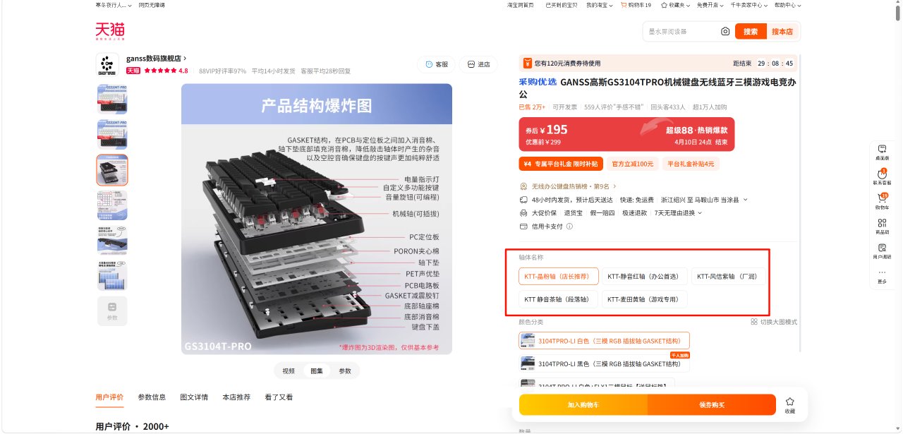 GS3104T PRO有5款轴体可选,购买页面都标注了各个轴体特点,可以说是给到了适配全场景的轴体选择方案: