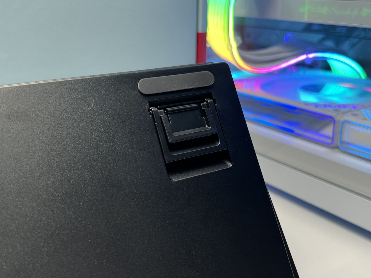 三模切换开关、Type-C口和2.4G接收器收纳仓都集中在一起,位置居中,伸手就能拨动开关和拿取接收器,还是很方便的。