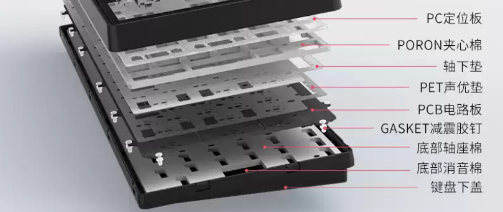键盘结构升级成了现在主流的Gasket结构,填充给到了5层消音填充:
