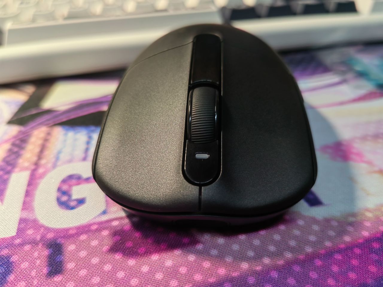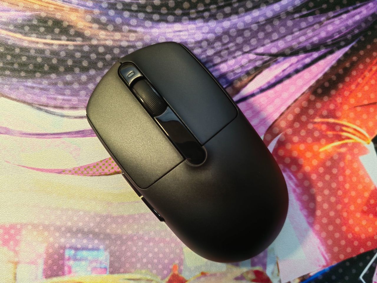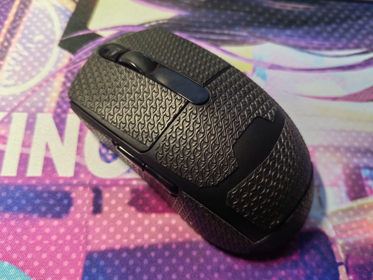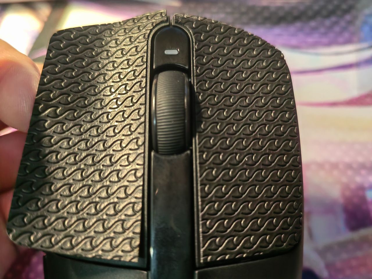 手感不错,摩挲起来不会黏手,摸上去像轻薄的橡胶,能明显感觉到鼠标表面多了一层细腻的纹理,总结就是【涩而不糙】