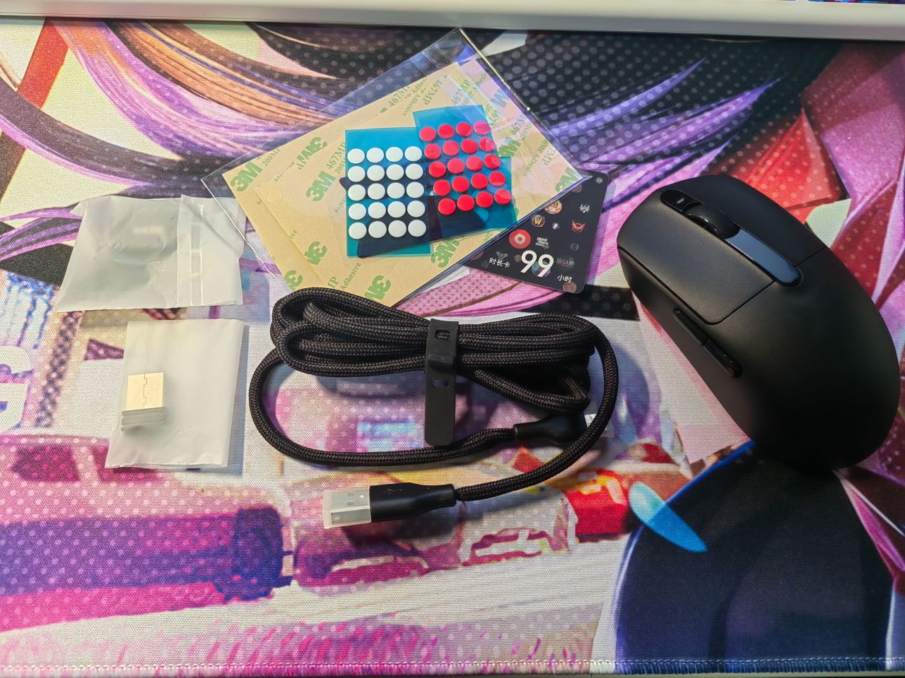 打开包装,是一套齐全的全家福,作为主体的鼠标外观简洁大气,是我喜欢的类型;配件包含接收器、防滑贴和脚贴,甚至还送了一张*****的CDK卡。