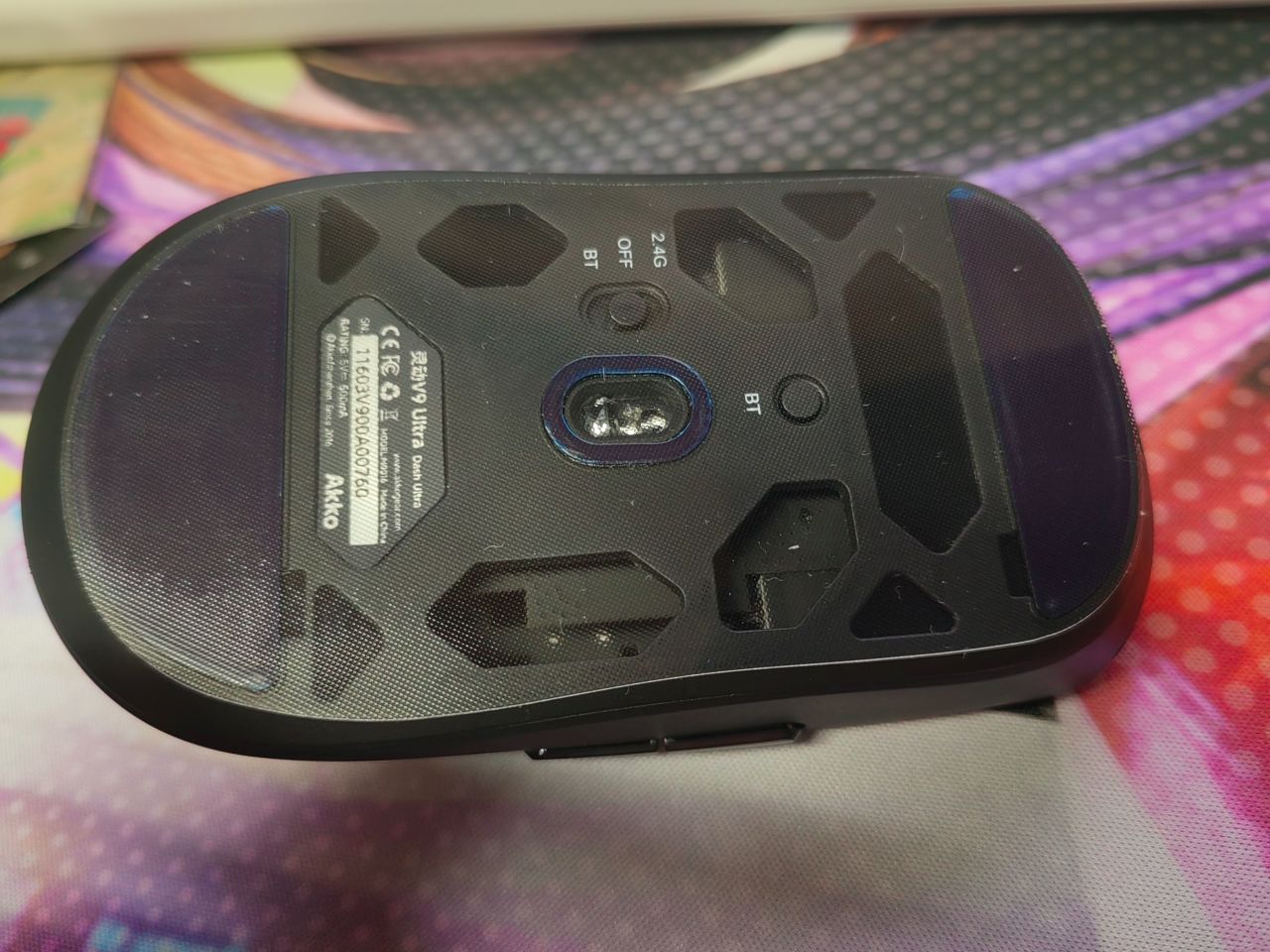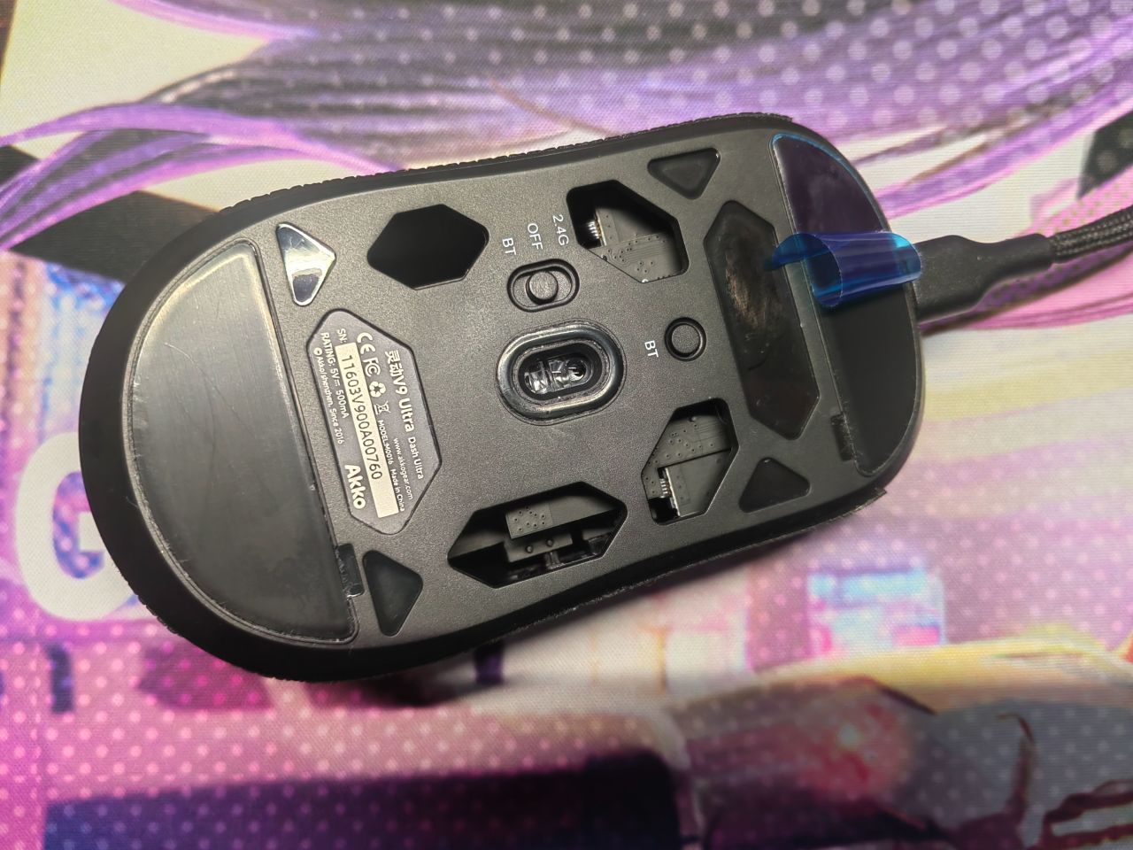 撕下来之后就会发现还有第二关,脚贴位置的蓝紫色膜同样要撕下来 ,这就是鼠标的出厂保护膜,并不是脚贴,难绷的是我用了一个月才发现,撕下来直接获得一个【崭新出厂】鼠标