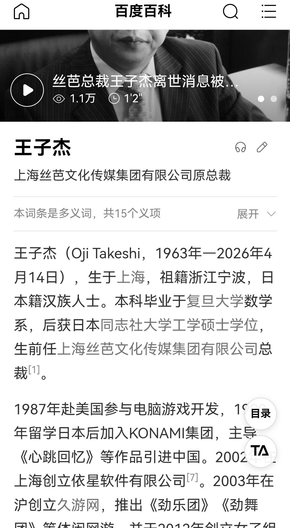 1987年赴美国参与电脑游戏开发,1990年留学日本后加入KONAMI集团,主导《心跳回忆》等作品引进中国。2003年在沪创立久游网,推出《劲乐团》《劲舞团》等休闲网游,并于2012年创立女子组合SNH48。久游网曾于2007年筹划日本上市期间遭遇《劲舞团》代理权纠纷,后经调解恢复运营。2008年《劲舞团》因内容争议被文化部通报批评。