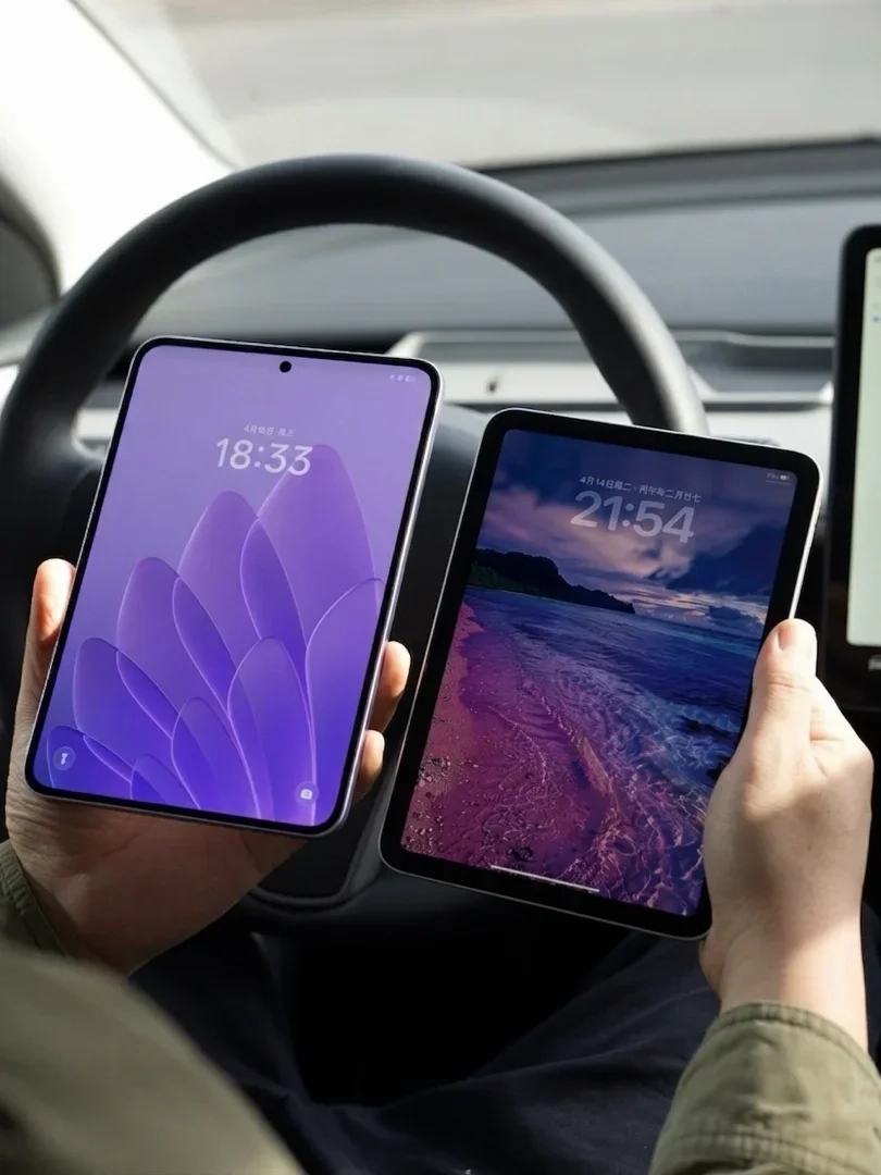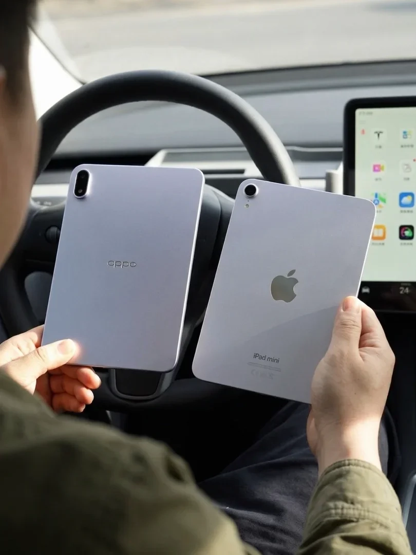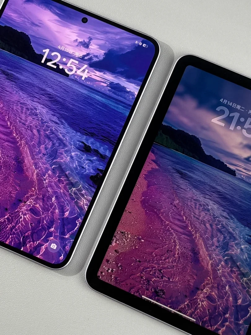 我之前主力是 iPad mini 7,对小尺寸平板很有好感,这次入手 OPPO Pad Mini 莫奈紫,实物比照片更耐看,背板有细腻光感纹理,手感温润、不容易沾指纹。iPad 8.3英寸,OPad 8.8英寸稍大些,但单手握着都很稳,放进小挎包、通勤袋完全不占地。OPPO Pad Mini 整机厚度 5.46mm,重量 282g;iPad mini 7 厚度 6.3mm,重量 293g,日常随身带的手感差异很直观。OPPO Pad Mini 的 2.99mm 极窄边框,对比iPad的宽黑边,观感上一个档次。