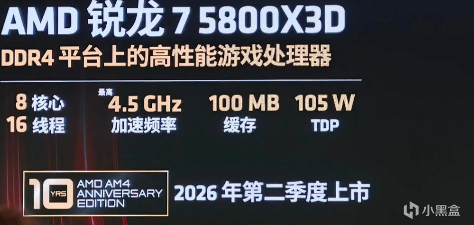爆料人 HXL 分享了一张疑似 AMD Ryzen 7 5800X3D“10 YRS AMD AM4 Anniversary Edition”(AMD AM4 十周年纪念版)的宣传图。 图片显示该处理器将于 2026 年第二季度发布,并列出了 8 核心 16 线程、最高睿频 4.5GHz、100MB 缓存和 105W TDP 等参数。这些参数与 AMD 官方发布的 Ryzen 7 5800X3D 产品规格相符。