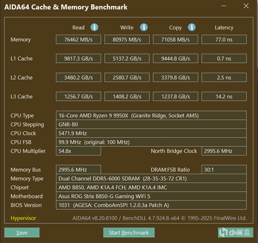 我对于这个数据多少还是有点不满意,而在开启EXPO之后这个数据来到了好转,不仅时序来到C28,而且读写速度都在80GB/s左右的速度,频率来到了6000MHz,延迟降低到了77ns,可以说是非常合适了