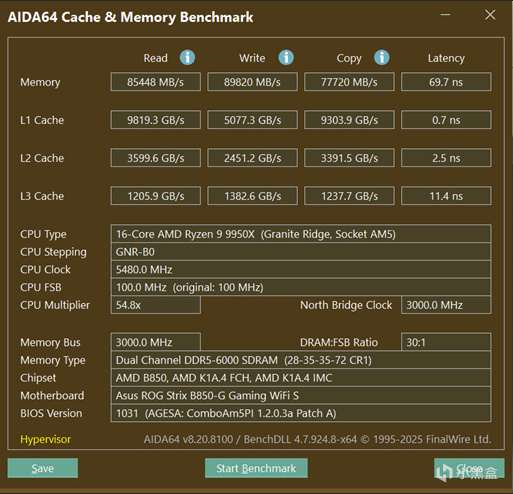 如果还想进一步压榨内存性能,但对超频有一定的敬畏,那么可以开启主板自带的内存“黑科技”,比如我用的是华硕的主板,开启“EXPO Tweaked”,内存的延迟降到了69ns,并且读写速度都达到了90GB/s的速度,可以说是非常出色了,需要更高水平就只能自行调参超频了,这边就不做展示了