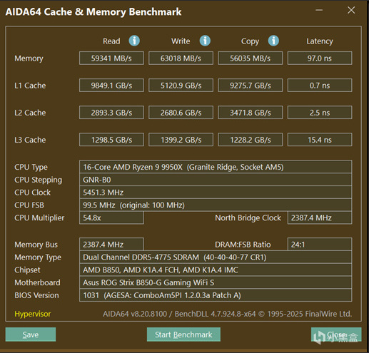 至于性能方面,因为说AMD更合适,于是我从我哥们那里接来了一套9950x+b850的组合,这次我们就用这套组合来看看内存条的真正实力,首先是默频的4800MHz,其数据可以说非常糟糕,不仅延迟达到了97ns,而且读写速度也就60GB/s左右,可以说和早期镁光几乎没有差别