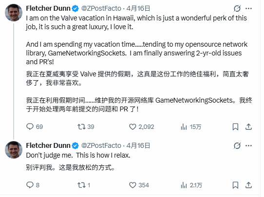 作为负责网络技术的工程师,Dunn 坦言,自己在度假期间重点优化了开源网络库 GameNetworkingSockets,还修复了几个遗留已久的旧错误。可能有圈外朋友不懂这是什么,说白了就是优化游戏网络连接的核心工具,能减少玩家联机时的卡顿、掉线问题,玩《CS2》《DOTA2》的玩家都能直接受益。