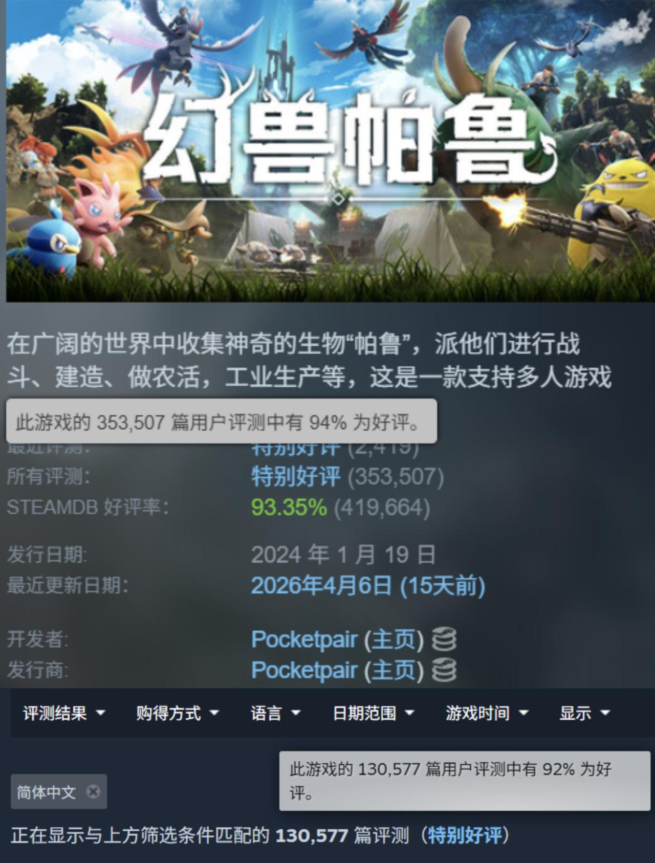 而对比大热的《幻兽帕鲁》来说,这个数字则超过了3成,国区好评跟外区也基本持平。