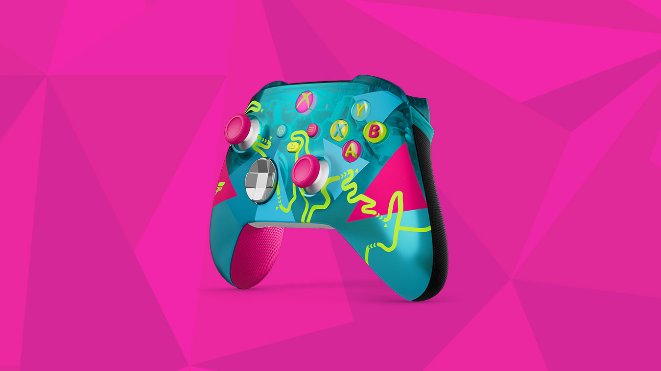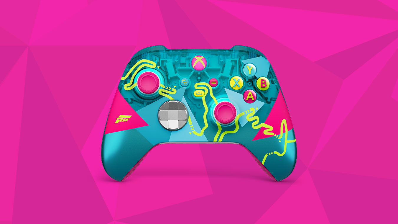 透过半透明上盖与扳机,一览鲜艳粉红色和绿色 Xbox 按钮的动态灯光效果。 透过醒目的粉红色摇杆、多色 ABXY 按钮,以及电池盖上印着的 Horizon 标志,让你沉浸于 Horizon Festival 气氛,展现独特风格。 在主机、电脑和云端加入节庆。