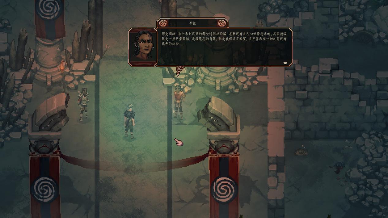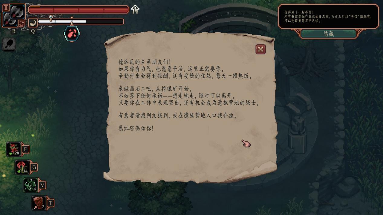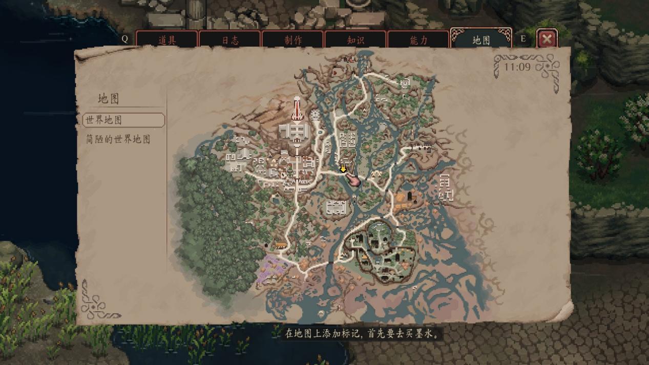 作为2D开放世界游戏,本作的内容量很庞大,路边随便和一个NPC聊天可能就会触发一段任务,但是游戏本身对于探索引导做的很薄弱。制作组也不会在地图上给你标满问号,只会在任务日志里面给你个大致方向,剩下的全靠你自己看对话内容、观察周围的环境,顺着那个方向去探索,然后可能在路上又遇到一个新任务。